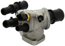 Anche per questa tipologia di termostati la loro applicazione è sulla testa cilindri. Sono realizzati in forme complesse e dotati di tubazioni per l’asservimento dei vari circuiti motore (riscaldatore, intercooler, EGR cooler ecc.). Sono generalmente realizzati con vari materiali, lega di alluminio, materiali termoplastici e tubazioni in ferro zincato. Dotati anche di sensori di temperatura costituiscono un modulo completo per il controllo della temperatura motore.